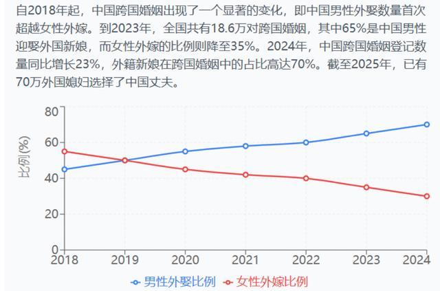 在过往很长的一段时间内,在大众印象中,中国女性外嫁是跨国婚姻的主流叙事,象征着对更发达经济体的向往。但自2018年起,剧情却悄然反转了,中国男性迎娶外籍配偶的数量首次超越了女性外嫁,并且这个差距在近年来持续拉大。